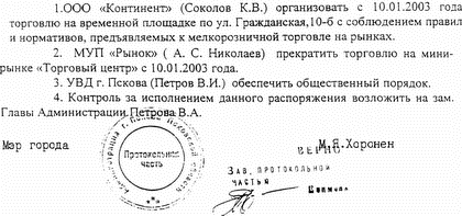 На этот раз причиной конфликта стало распоряжение мэра Пскова Михаила Хоронена. Согласно этому документу МУП «Рынок» было предписано 10 января 2003 года прекратить торговлю на мини-рынке «Торговый центр», а некоему ООО «Континент» организовать торговлю на временной площадке по ул. Гражданская, 10-б (бывшая территория завода АТС).