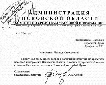 На этот раз комитет по СМИ администрации области вынес на рассмотрение учредителей «Новостей Пскова» - коллектива журналистов, мэрии города и Псковской городской Думы - официальное письмо, в котором просит включить комитет по СМИ администрации Псковской области в состав учредителей город-ской газеты. В письме, подписанном председателем комитета Александром Сотником еще 9 декабря 2002 года, желание администрации области изложено без мотивации. Официально представители областных властей говорят, что речь идет только о финансовой помощи газете и публикации на ее страницах информации о деятельности областной администрации.