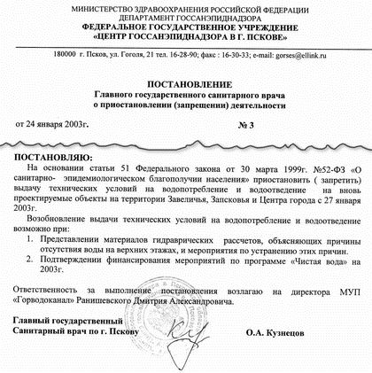 Человек состоит из воды на 70-90%. Максимальное содержание воды – в головном мозге; мозг на 95% – это вода. Качество воды, которая попадает в наш организм – и в том числе в орган, отвечающий за работу нашего сознания, – вопрос отнюдь не праздный. Поэтому постановление главного врача госсанэпидемнадзора в Пскове Олега Кузнецова от 24 января текущего года вызывает живой, хотя немного нервный интерес.