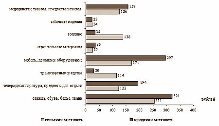 Сельское население в 2005 году использовало на покупку непродовольственных товаров денежных средств на 12 процентов меньше, чем городское, в том числе на покупку мебели, домашнего оборудования – на 42,4 процента, телерадиоаппаратуры, предметов для отдыха, увлечений – на 37,1, строительных материалов – на 30,6, одежды, обуви, тканей - на 20,6, медицинских товаров, предметов гигиены – на 19,7 процента. В то же время расходы на топливо у сельского населения были выше, чем у городского населения в 4,1 раза, на транспортные средства, включая запчасти – в 3,8 раза.