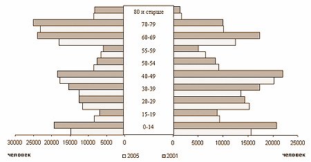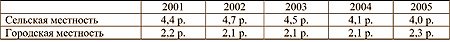 В 2001–2005 годах численность сельского населения уменьшалась в среднем за год на 2 процента, городского - на 1 процент, что объясняется более высоким соотношением уровня смертности и рождаемости сельских жителей.