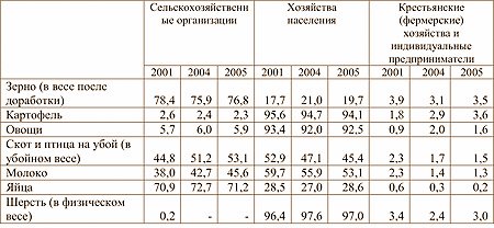 В 2005 году основной объем производства зерна (76,8% общего объема производства этой культуры), яиц (71,2%), скота и птицы на убой в убойном весе (53,1%) приходился на сельскохозяйственные организации. В хозяйствах населения сосредоточено основное производство картофеля (94,1% общего сбора этой культуры), овощей (92,5%), шерсти (97%). Доля производства по основным видам сельскохозяйственной продукции в крестьянских (фермерских) хозяйствах и индивидуальных предпринимателей варьировала от 0,2 до 3,6 процента общего объема производства.