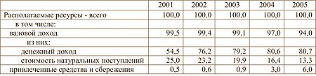 В структуре располагаемых ресурсов сельских домохозяйств в 2001-2005 годах наблюдалось увеличение удельного веса денежных доходов, привлеченных средств и сбережений, снижение удельного веса натуральных поступлений (в денежном выражении).