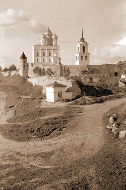 С середины XV в., после возведения крепостных стен Окольного города, окончательно сложилась величественная панорама Псковской крепости от реки Великой, поражавшая иностранные посольства и купеческое сословие гостей. Не случайно на иконах с изображениями Пскова [ 4 ] город показан с высоты птичьего полета, с запада.